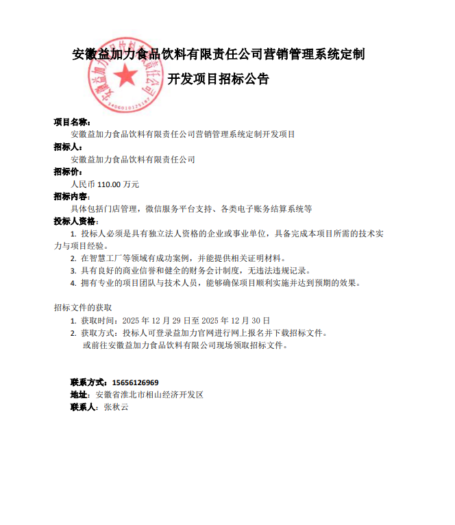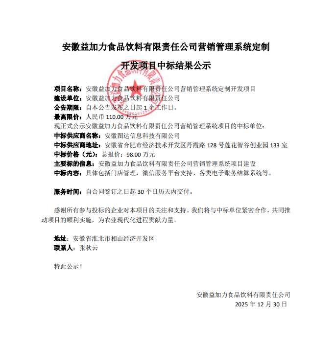 安徽益加力食品饮料有限责任公司营销管理系统定制开发项目中标结果公示